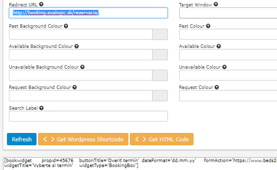 - Potrebné nastavenia sa vykonávajú v účte v Beds24 v ponuke Settings/Booking Engine/Booking Widgets. Tu je podľa vykonaných nastavení možné vygenerovať kód (stlačením tlačidla Get Wordpress Shortcode), ktorý si následne môžete skopírovať do widgetu Beds24 Booking Widget v administračnom rozhraní vašej webovej stránky vo WordPresse.