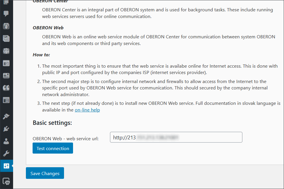 - V ponuke Nastavenia/OBERON - WP Add-in do poľa OBERON Web - adresa webovej služby zadajte externú IP adresu spravidla s číslom portu, napr. v tvare http(s)://xxx.xxx.xxx.xxx:pppp. Zadaný port musí byť povolený v bráne firewall.