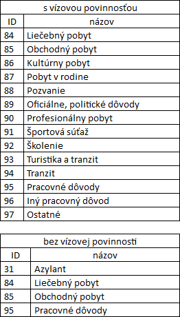 Číselník účelov pobytu hostí s vízovou a bez vízovej povinnosti