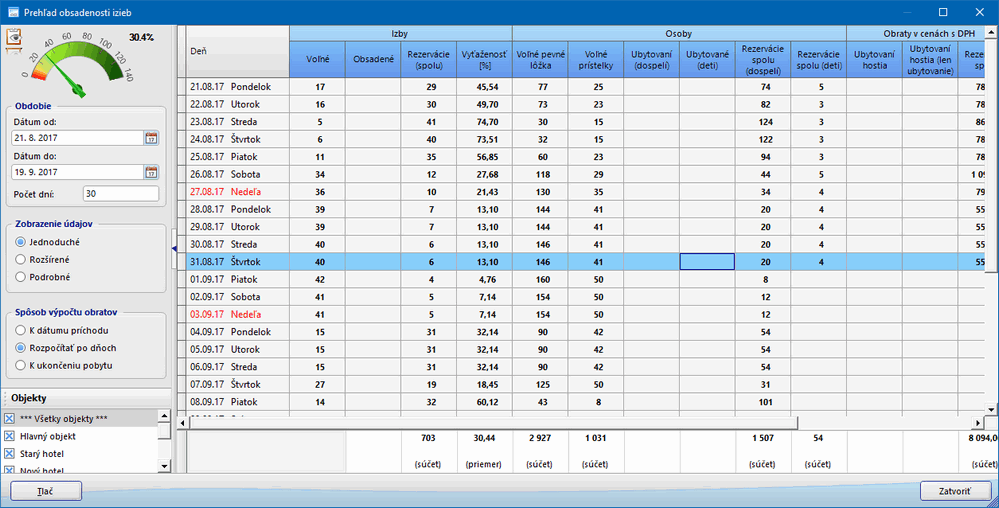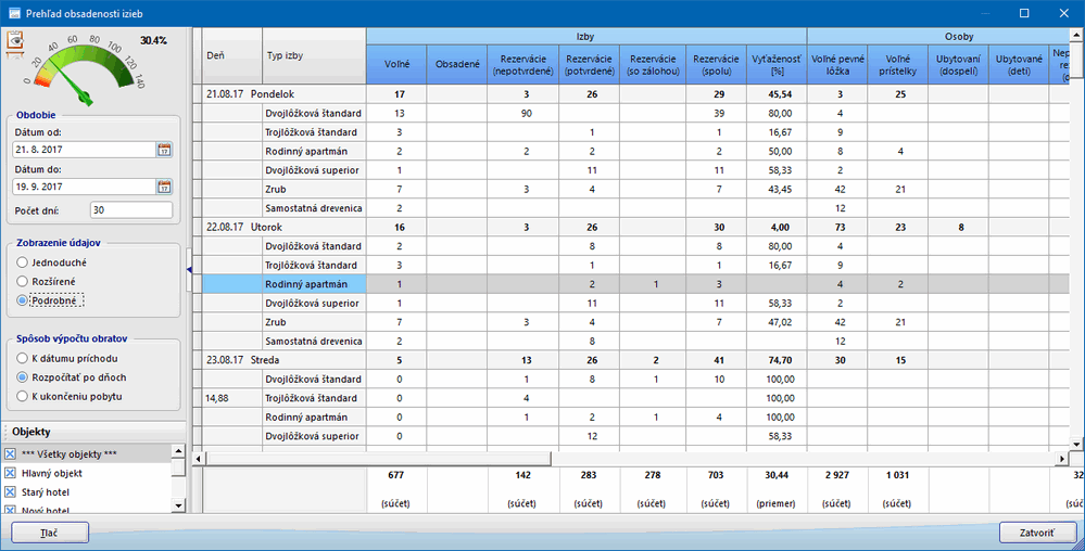 Podrobné - zobrazuje prehľad obsadenosti v členení podľa izieb, ako aj podľa typov izieb, sú zobrazené všetky stĺpce prehľadu.