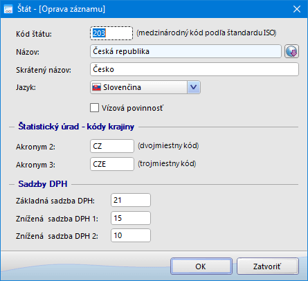 Jeho výberom sa automaticky vyplnia polia Kód štátu, Skrátený názov a Štatistický úrad - kódy krajiny (Akronym 2 a Akronym 3).