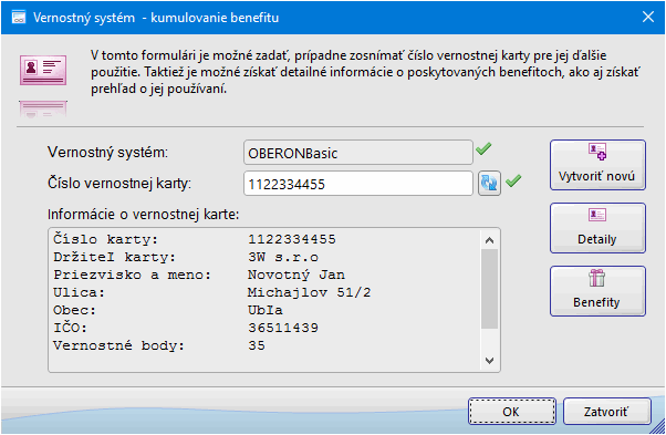 Formulár Vernostný systém - kumulovanie/čerpanie benefitu umožňuje zaevidovať (aktivovať) vernostnú kartu (RFID kľúč) a kumulovať/čerpať benefity pri práci s vernostným systémom v systéme OBERON. De facto ide až o tri obsahovo takmer totožné formuláre s rozdielnym názvom - formulár Vernostný systém - kumulovanie benefitu, formulár Vernostný systém - čerpanie benefitu a Vernostný systém - info, ktoré poskytujú prístup k detailným informáciám o dostupných benefitoch, ako aj o použití danej vernostnej karty.