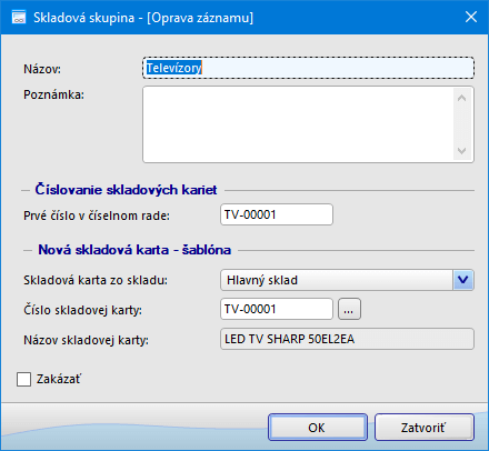 - Po prípadnej úprave (zmene) názvu skladovej skupiny sa názov skladovej skupiny automaticky upraví aj na všetkých skladových kartách tejto skupiny (vo formulári Skladová karta, záložka Základné).