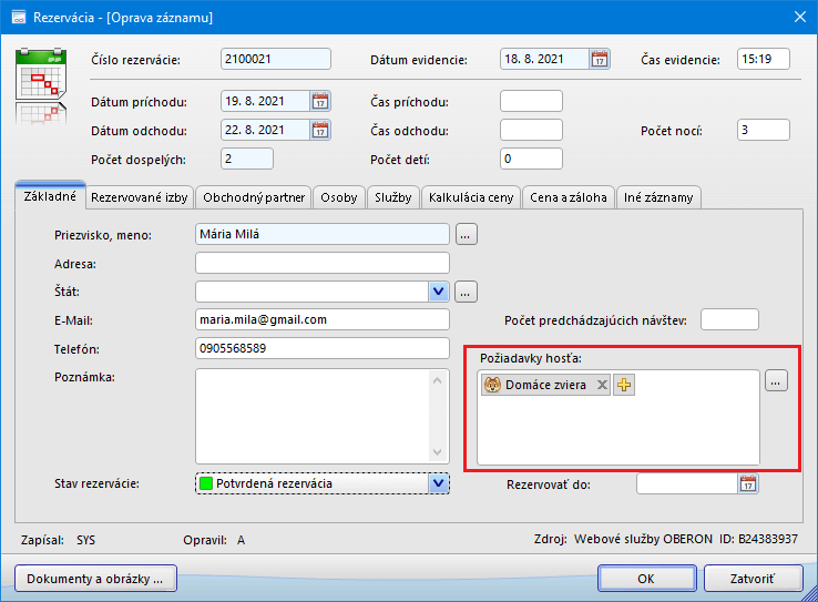 Táto téma Pomocníka je venovaná možnosti zaevidovať rôzne požiadavky hosťa v module Hotelová recepcia (napr. detská postieľka, špeciálna strava, pes, kytica a pod.).