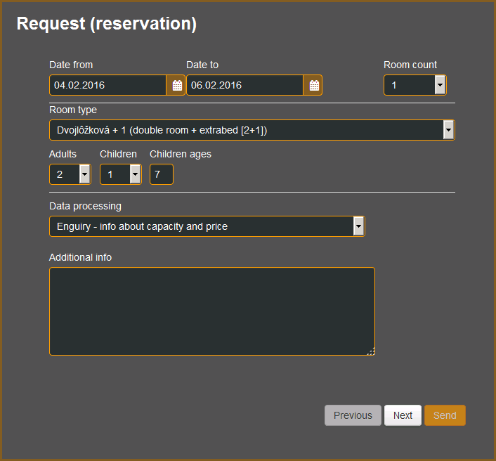 - Rezervačný formulár umožňuje po vykonaní rezervácie hosťom na internetovej stránke automaticky zapísať rezerváciu (alebo dopyt na ubytovanie) do evidencie rezervácií a vzápätí ju zobraziť v grafickom prehľade izieb. Rezervovať je možné jednu, prípadne aj viac izieb, pričom je možné overiť stav voľných izieb aj s automatickým výpočtom ceny za ubytovanie.