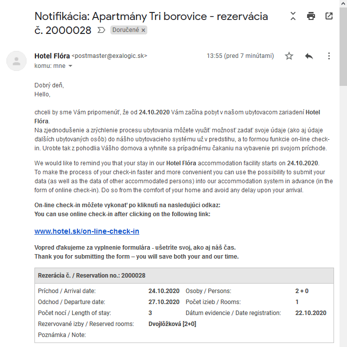 Obrázok č. 1: Notifikačný e-mail pre hosťa s odkazom na registračný formulár na webovej stránke ubytovacieho zariadenia (pre check-in)