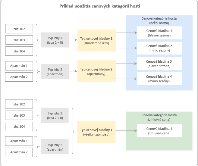 Obrázok č. 1 znázorňuje dve cenové kategórie hostí, z ktorých prvá má nadefinované dve cenové hladiny (hlavná sezóna a mimo sezóny) pre typ cenovej hladiny určenej pre štandardné izby a dve ďalšie cenové hladiny pre typ cenovej hladiny určenej pre apartmány. Druhá cenová kategória hostí má nadefinované jednu cenovú hladinu pre obchodného partnera (zmluvná cena) pre typ cenovej hladiny určenej pre všetky typy izieb.