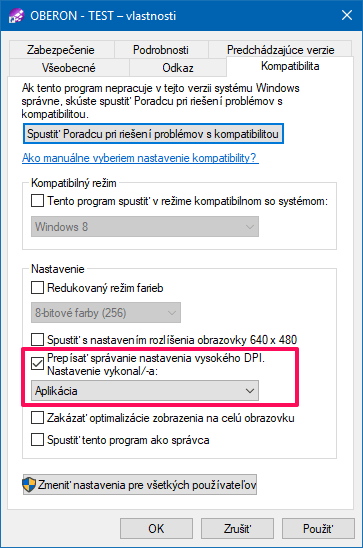 - Na niektorých počítačoch sa po zmene rozlíšenia na inú hodnotu OBERON javí ako rozmazaný. V takomto prípade kliknite na ikonu OBERON-u, stlačte pravé tlačidlo myši a vyberte položku Vlastnosti. Otvorí sa formulár (Obrázok č. 2), v ktorom v záložke Kompatibilita začiarknite možnosť: Prepísať správanie nastavenia vysokého DPI. Ak sa záložka Kompatibilita vo formulári nenachádza, stlačte pravé tlačidlo myši a vyberte položku Riešiť problémy s kompatibilitou.