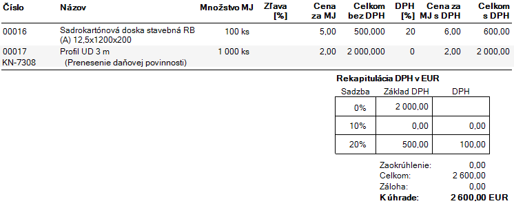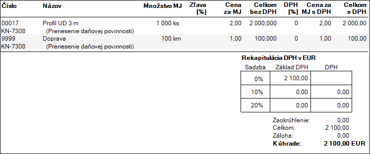 Firma predáva stavebný materiál 1 000 kusov profilov UD v sume 2 000,00 €. Na profil UD sa vzťahuje prenesenie daňovej povinnosti. Na skladovej karte Profil UD je zadaný kód kombinovanej nomenklatúry colného sadzobníka. Po pridaní položky do faktúry OBERON tovaru automaticky priradí nulovú sadzbu DPH a do poznámky uvedie text Prenesenie daňovej povinnosti. V závislosti od nastavení po výbere predkontácie na položke v doklade (tlačidlo Oprava, záložka Rozúčtovanie) program nastaví položke aj správny typ DPH. Keďže doprava súvisí s tovarom v režime prenesenia, podlieha rovnakému režimu zdanenia ako tento tovar. Na položke Doprava je potrebné zadať rovnaký kód kombinovanej nomenklatúry colného sadzobníka ako je zadaný pri Profile UD.
