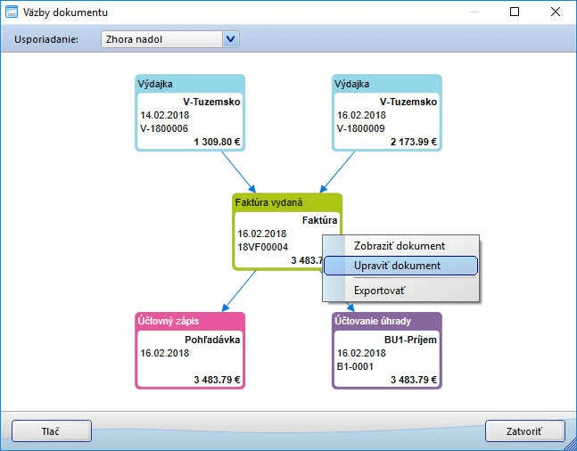 Obrázok č. 1: Väzby dokumentov - dve výdajky vyúčtované faktúrou, účtovný zápis a zaúčtovanie úhrady