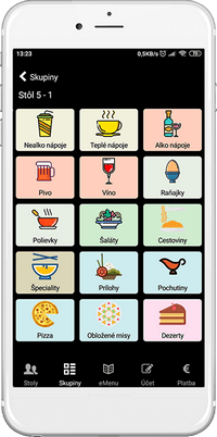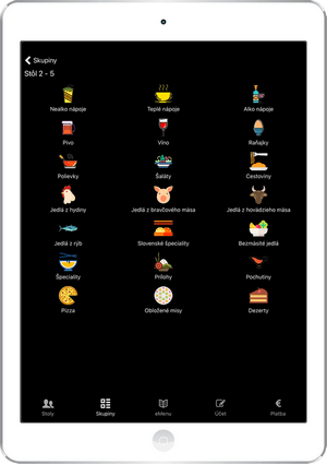 - Dostupné je z ponuky Skupiny (Nealko nápoje, Polievky, Šaláty, Dezerty a pod.) v hlavnej ponuke aplikácie (pozri vyššie).