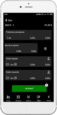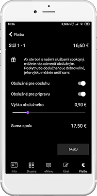 - Platba - umožňuje privolať obsluhu na úhradu účtu a v prípade spokojnosti s obsluhou zadať výšku obslužného (prepitné) pre obsluhu, resp. prípravu. Maximálna výška obslužného je v aplikácii nastavená na 20 €.