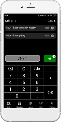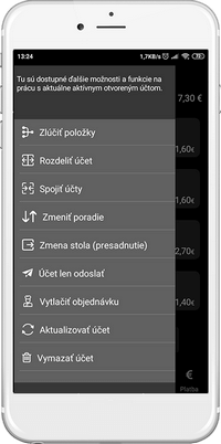 - Rozdeliť účet - rozdelí položky daného účtu do dvoch samostatných účtov (ak sa napr. hostia pri jednom stole rozhodnú, že každý z nich bude platiť zvlášť).