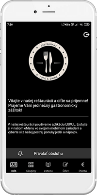 - Info - v závislosti od nastavení obsahuje informácie o reštauračnej prevádzke, napr. logo, uvítací text a pod. s možnosťou privolať obsluhu.