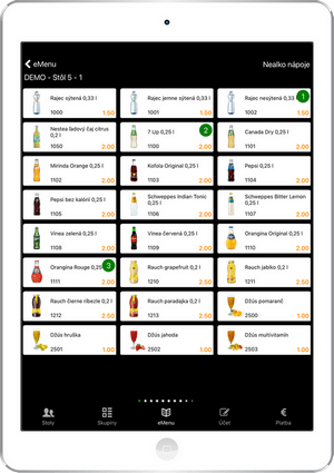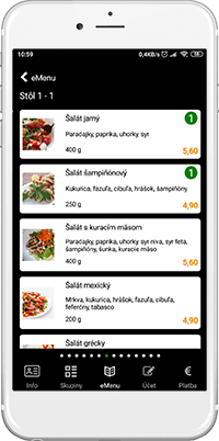 - Jedálny/nápojový lístok je vždy aktuálny, zákazníka informuje tak o dostupných, ako aj o dočasne nedostupných položkách (v eMenu majú inú farbu ceny a nie je ich možné objednať).