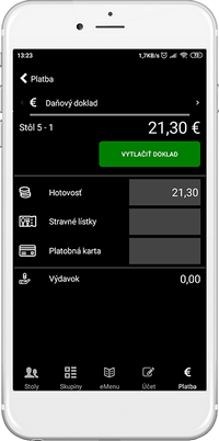 - Daňový doklad - na uzatvorenie účtu zaevidovaním daňového dokladu. Sumu na úhradu je možné rozčleniť podľa vybraných typov platieb Hotovosť, Stravné lístky a Platobná karta. Stlačením tlačidla VYTLAČIŤ DOKLAD sa platba zaeviduje a vytlačí sa pokladničný doklad na fiškálnom zariadení (platba sa posiela cez danú webovú službu, ktorá komunikuje priamo s fiškálnym zariadením).
