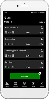 - Účet - obsahuje položky otvoreného účtu. Dlhým stlačením (long press) položky sa otvorí ponuka, v ktorej je možné upraviť množstvo položky, zadať poznámku k objednávke a oddeľovač chodov, prípadne pridať na účet tú istú položku ako novú položku. Jednotlivé poznámky k objednávke (napr. dobre prepiecť, bez prílohy a pod.) sa definujú v Pokladnici OBERON - Poznámky pre tlač do kuchyne. Stlačením tlačidla OBJEDNAŤ sa ešte neobjednané (neodoslané a nevytlačené) položky odošlú do OBERON-u a vytlačia na bonovacej tlačiarni (prípadne zobrazia na bonovacom monitore).