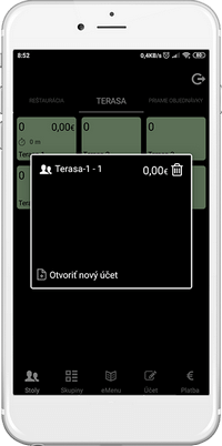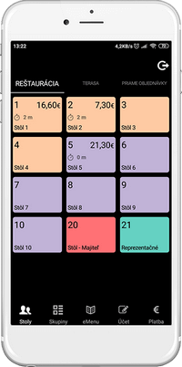 - Stoly - stoly priradené danej zóne. Krátkym klepnutím na vybraný stôl sa pod týmto stolom otvorí nový účet. Dlhým stlačením (long press) sa vyvolá ponuka, v ktorej možno otvoriť účet s možnosťou zadať mu pomenovanie, prípadne otvoriť ďalší účet pod daným stolom. Stoly je možné zobraziť v dvoch alebo troch stĺpcoch (nastavujú sa v aplikácii v ponuke Používateľ). V ponuke vyvolanej dlhým stlačením je možné zmeniť pomenovanie stola.