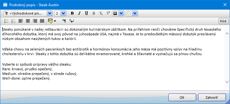 - Základný text sa k položke pridáva vo formulári Skladová karta ako Podrobný popis… (záložka Základné). V podrobnostiach sa zobrazuje v sekcii pod čiarou. Tento text môže byť vhodne doplnený krátkym textom – rozšíreným popisom jedla/nápoja, ktorý sa zobrazuje nad čiarou a na skladovej karte sa v rovnakej záložke pridáva ako Doplňujúci text. Zároveň je v podrobnostiach možné zobraziť informáciu o nutričnej hodnote a prípadných alergénoch – údaje sa zadávajú na skladovej karte typu receptúra po stlačení tlačidla Zloženie (záložka Základné) (pozri Obrázok č. 1 a 3).