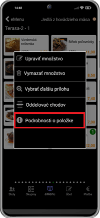 - Podrobnosti o položke možno v aplikácii LUKUL zobraziť v ponuke eMenu dlhým stlačením (long press) - otvorí sa ponuka, v ktorej je potrebné zvoliť Podrobnosti o položke (Obrázok č. 1).