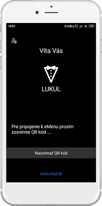 v režime LUKUL - mobilný čašník je možné aplikáciu prepnúť do režimu LUKUL - eMenu a nasnímať QR kód na otvorenie účtu (napr. v prípade, že sa čašník chce prihlásiť ako hosť na objednanie jedla/nápoja, ale aj na testovacie účely, keď je potrebné overiť funkčnosť QR kódov na jednotlivých stoloch).