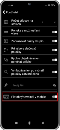 Na použitie hardvérového platobného terminálu (PAX, FiskalPRO, AXASOFT) je potrebné v nastaveniach aplikácie LUKUL v ponuke Používateľ zakázať funkciu Platobný terminál v mobile. |