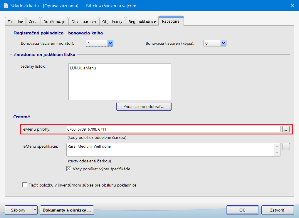 - V záložke Receptúra v časti Ostatné pri poli eMenu prílohy stlačte tlačidlo výberu