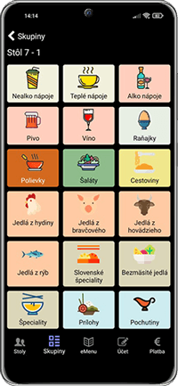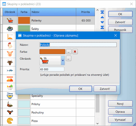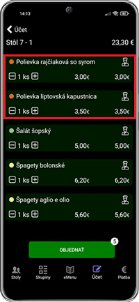 - Tým je možné docieliť, že ak bude napr. skupine Polievky priradená najvyššia priorita, položky patriace do tejto skupiny sa automaticky zoskupia v prvej časti objednávky a ostatné jedlá budú nasledovať až po nich (podľa priority pridelenej ostatným skupinám). Zároveň budú jednotlivé položky odlíšené guľôčkou vo farbe skupiny, ku ktorej prislúchajú.