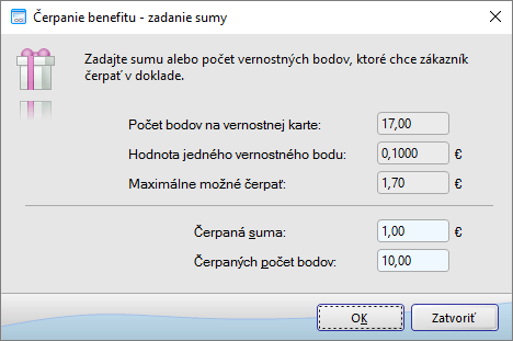 - Po stlačení tlačidla OK sa benefit uplatní - na doklad sa aplikuje zľava alebo sa doň pridá darčeková položka. Na vernostnej karte sa počet vernostných bodov zníži o hodnotu bodov čerpaných darčekových položiek.