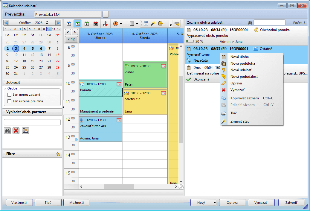 - Stlačením pravého tlačidla myši v grafickom prehľade program umožňuje vyvolať kontextovú ponuku, kde je možné priamo veľmi jednoducho a rýchlo pracovať s jednotlivými záznamami: pridať novú udalosť (a to aj z reklamácie/servisu), upraviť existujúcu udalosť, pridať k existujúcej udalosti podudalosť, resp. podúlohu atď.