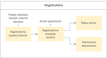 - Všetky registratúrne záznamy účtovnej jednotky (prijatá a odoslaná pošta, rôzne interné záznamy atď.) sa evidujú v Registratúrnom (podacom) denníku. Spravidla po skončení účtovného obdobia účtovná jednotka presúva záznamy z Registratúrneho (podacieho) denníka do Registratúrneho strediska (archívu). Po ukončení času nutného na skladovanie záznamov je možné požiadať príslušný úrad o fyzické odstránenie dokumentov - skartovanie. Štátny archív si môže vyžiadať niektoré záznamy. Viac informácií o vyradení a fyzickom odstránení dokumentov získate v téme Vyradenie a fyzická likvidácia registratúrnych záznamov.