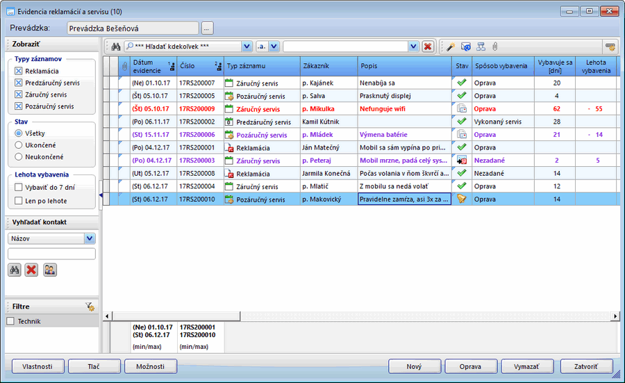 - Na zvýšenie prehľadnosti v evidencii je v ľavom paneli oddelenom rozdeľovacou lištou dostupný vstavaný filter, pomocou ktorého možno rýchlo filtrovať záznamy podľa typov záznamov (Reklamácia, Predzáručný servis...), stavu (Všetky, Ukončené, Neukončené) a lehoty vybavenia (Vybaviť do 7 dní, Len po lehote vybavenia).