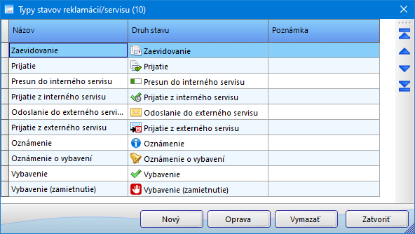 Stavy. Stav reklamácie/servisu možno zmeniť aj jednoduchým dvojklikom na ikonu stavu v stĺpci