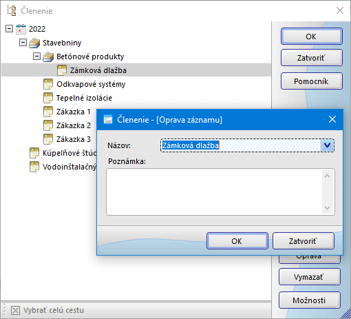 - V prípade, že chcete v členení danej vetvy pokračovať, vyberte list (napr. Betónové produkty) a stlačte tlačidlo Nový. Zadajte názov nového listu (napr. Zámková dlažba) a stlačte tlačidlo OK. Predchádzajúci list sa zmení na vetvu.