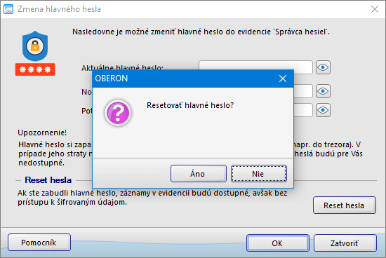 - Otvorí sa formulár Zmena hlavného hesla, v ktorom stlačte tlačidlo Reset hesla. Po stlačení tlačidla Áno sa hlavné heslo resetuje.
