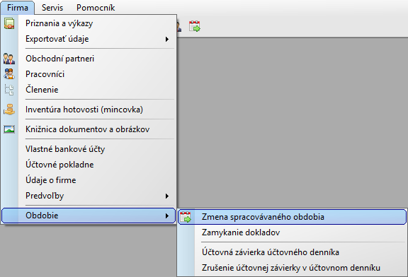 - V programe OBERON - Agenda firmy zvoľte ponuku Firma, Obdobie, Zmena spracovávaného obdobia.