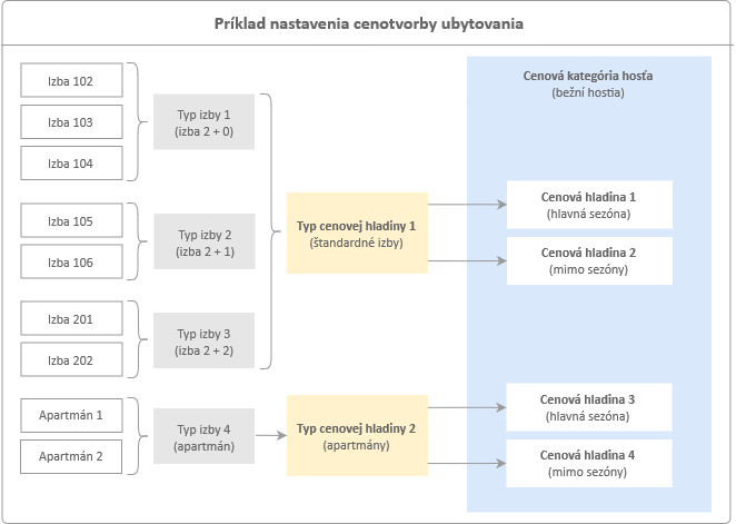 typ izby, preto ak ubytovacie zariadenie predáva rôzne izby s rôznou cenou (napr. štandardné izby, apartmány atď.), je potrebné nadefinovať viac cenových hladín. K jednému typu cenovej hladiny možno priradiť viac typov izieb (pozri Obrázok č. 1), preto nie je potrebné definovať cenovú hladinu pre každý typ izby (ale len pre daný typ cenovej hladiny).