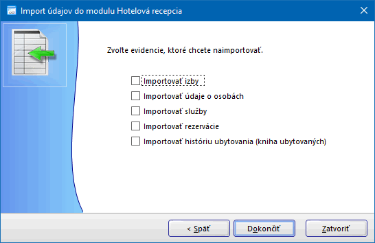Jednorazový import údajov z inej účtovnej jednotky (databázy) do aktuálnej pri zmene prevádzkovateľa ubytovacieho zariadenia, resp. zmene firmy (čísla IČO) daného prevádzkovateľa ubytovacieho zariadenia. Otvorí sa sprievodca, v ktorom je potrebné vybrať firmu a evidencie, z ktorých sa údaje naimportujú (izby, údaje o osobách, služby, rezervácie a históriu ubytovaných hostí). Pred importom vykonajte zálohovanie údajov (aktuálne údaje sa nevratne prepíšu).