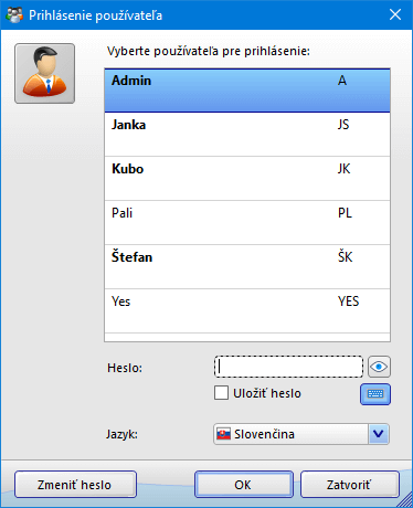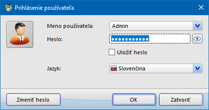 - Po prihlásení sa používateľovi pridelia jeho práva a načítajú sa jeho nastavenia programu vykonané v ponuke Servis, Nastavenia programu, sekcia Používateľ.