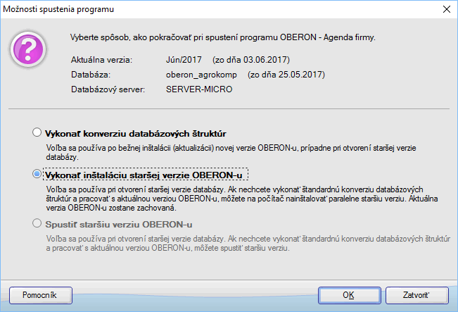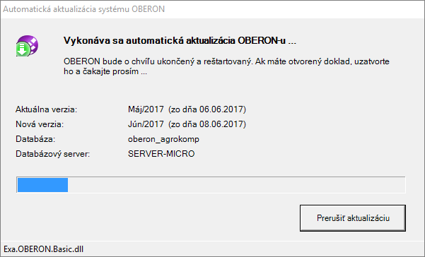 - Automatickú databázovú aktualizáciu je možné využiť len v prípade, že všetci používatelia majú v počítači rovnakú verziu OBERON-u. V tom prípade po inštalácii aktualizácie na jednom počítači zabezpečuje automatickú inštaláciu do všetkých klientskych počítačov, a to aj počas bežnej prevádzky.