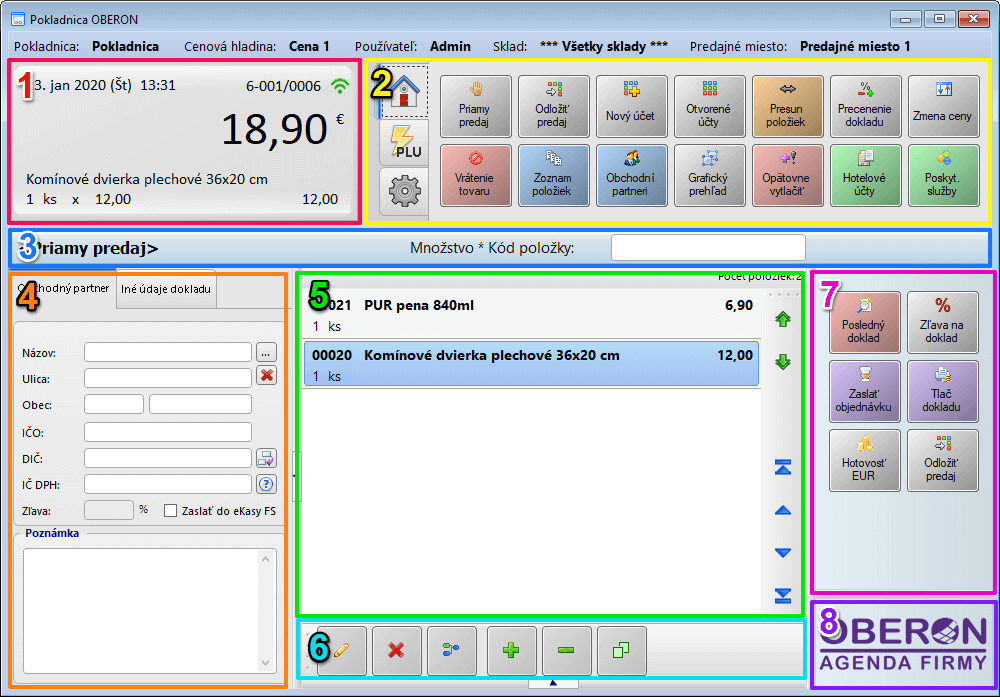 - Interaktívny formulár predstavuje používateľské rozhranie Pokladnice OBERON. Jeho vzhľad a funkčnosť možno prispôsobiť danej prevádzke, či už ide o bežnú maloobchodnú prevádzku, predajňu s viacerými predajnými miestami, veľkoobchodnú prevádzku alebo reštauráciu, bar, či zariadenie rýchleho občerstvenia (fastfood). Viac informácií získate v téme Nastavenie vzhľadu Pokladnice OBERON.