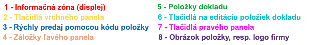 V závislosti od nastavení pravý bočný panel obsahuje tri sekcie - systémové tlačidlá, ktoré je možné nadefinovať podľa vlastných potrieb, dotykovú numerickú klávesnicu a obrázok položky, resp. logo firmy (pozri nižšie samostatný bod 8). Bližšie informácie o nastavení pravého bočného panela získate v téme Nastavenia vzhľadu Pokladnice OBERON.
