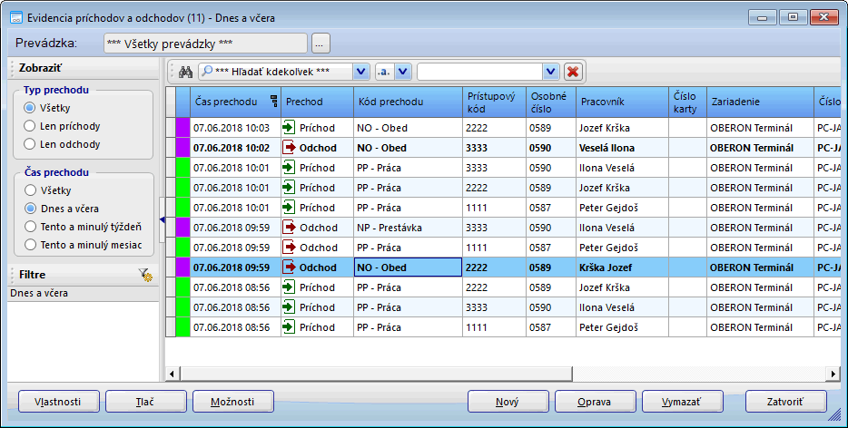 - Na zvýšenie prehľadnosti v evidencii je v ľavom paneli oddelenom rozdeľovacou lištou k dispozícii vstavaný filter, pomocou ktorého možno rýchlo filtrovať záznamy podľa typu (Všetky, Len príchody, Len odchody) a času prechodu (Všetky, Dnes a včera, Tento a minulý týždeň...).