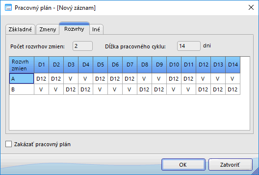 - Pracovný plán firmy pozostáva z pracovných zmien obsiahnutých v rozvrhoch pracovných zmien (v závislosti od typu prevádzky). Pracovnú zmenu Zákonník práce definuje ako „časť ustanoveného týždenného pracovného času, ktorý je zamestnanec povinný na základe vopred určeného rozvrhu pracovných zmien odpracovať v rámci 24 hodín po sebe nasledujúcich a prestávka v práci.“ Základné pracovné zmeny sú v systéme OBERON preddefinované - viac informácií získate v téme Pracovné zmeny.