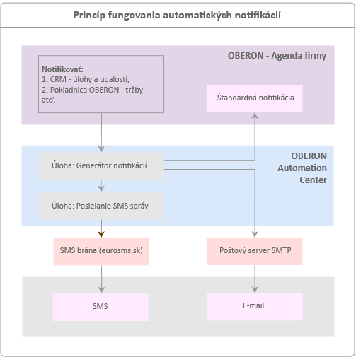 - Automatické notifikácie v systéme OBERON sú nástrojom, ktorý umožňuje jeho používateľov, obchodných partnerov a prípadne ďalšie osoby automaticky informovať o určitých skutočnostiach, napr. o blížiacom sa stretnutí zaevidovanom v CRM, o určitej udalosti, ktorá nastala (odoslanie tržby za pokladnicu po vykonaní dennej uzávierky majiteľovi podniku, odoslanie informácie o meškaní pracovníka zamestnávateľovi alebo o prijatej on-line rezervácii ubytovania...) atď. Informovanie sa spravidla vykonáva formou e-mailovej, resp. SMS správy. Zoznam typov (možností) notifikácií a ďalšie informácie o notifikáciách, ako aj o ďalších možnostiach ich generovania v systéme OBERON získate v téme O automatických notifikáciách.