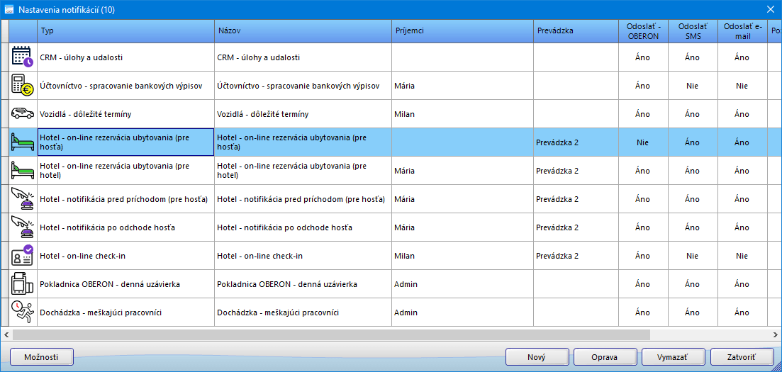 Pred príchodom hosťa systém OBERON zasiela e-mailovú alebo SMS správu s informáciami napr. o polohe hotela, parkovaní a pod. V notifikačnej správe je možné zaslať aj výzvu s odkazom na osobitný formulár na webovej stránke ubytovacieho zariadenia na zadanie identifikačných údajov hosťa, prípadne aj ďalších osôb ešte pred príchodom do ubytovacieho zariadenia v rámci tzv. pre check-inu (viac informácií je možné získať v téme Pre check-in). |