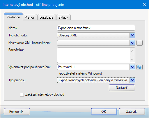 - Prejdite späť do záložky Základné, v ktorej stlačte tlačidlo Nastaviť na podrobné nastavenie prenosu. Otvorí sa formulár v závislosti od výberu typu prenosu. Bližšie informácie o jednotlivých nastaveniach sú k dispozícii v téme Formulár Internetový obchod - off-line pripojenie.