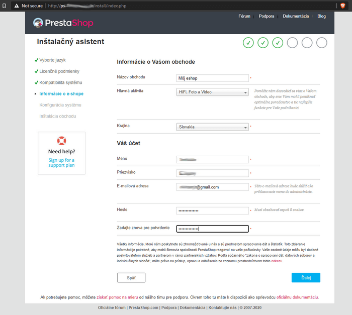 7. Pokračujte v inštalácii. Po jej úspešnom ukončení si odporúčame prihlasovacie údaje do administrátorského účtu v PrestaShope vytlačiť a odložiť.