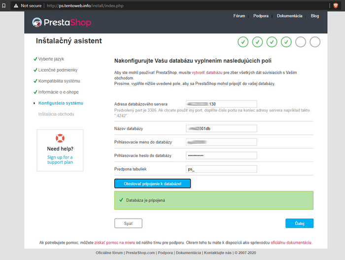 - Database name: (zadáva sa názov databázy, ktorý jej bol pridelený v kroku č. 1, napr. PrestaShop)