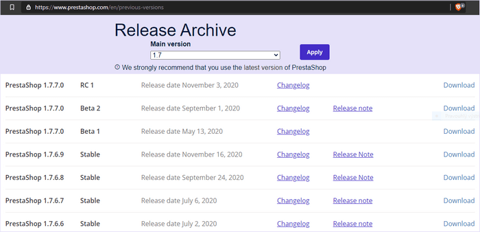 2. Inštalačné súbory internetového obchodu je možné získať priamo na adrese https://prestashop.com/versions/. Pred stiahnutím si je potrebné overiť, či daná verzia systému OBERON podporuje sťahovanú verziu. Odporúčame sťahovať najnovšiu stable verziu daného podporovaného radu PrestaShopu (beta verziu len v odôvodnených prípadoch).